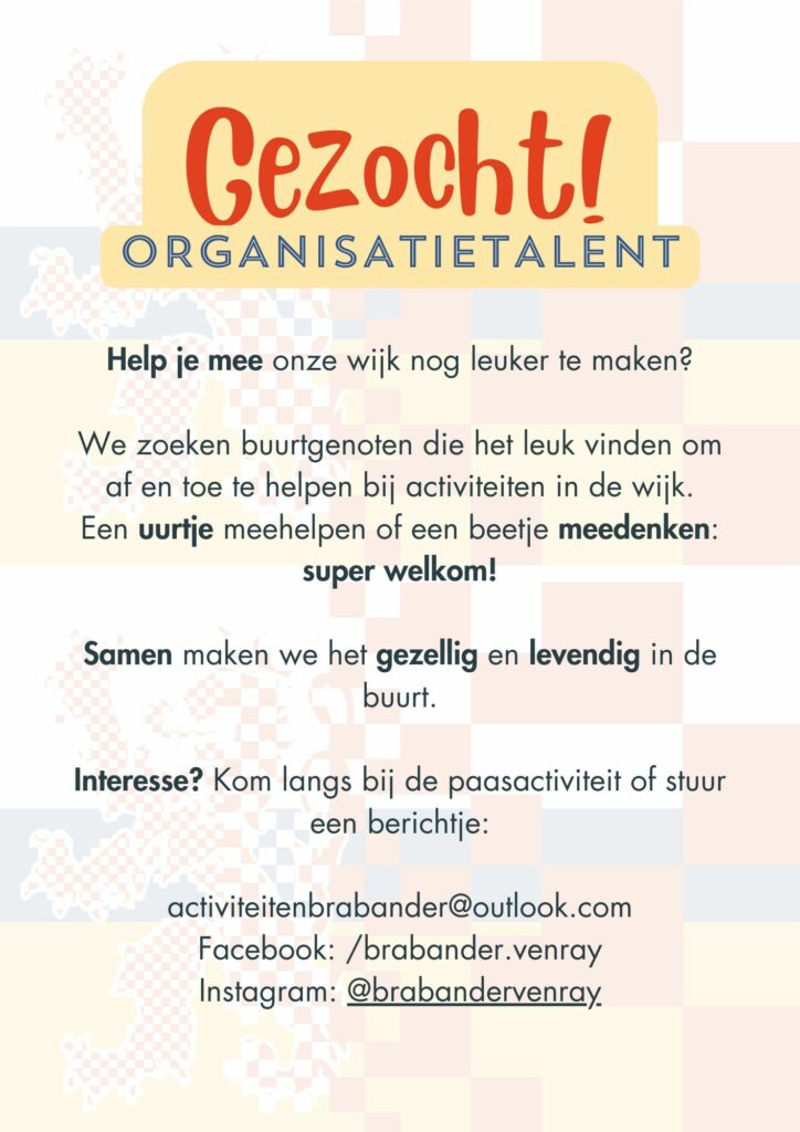 We zoeken nog wel wat hulp bij de organisatie en op de dag zelf wat handjes. De doorgang van de activiteit is hiervan afhankelijk.